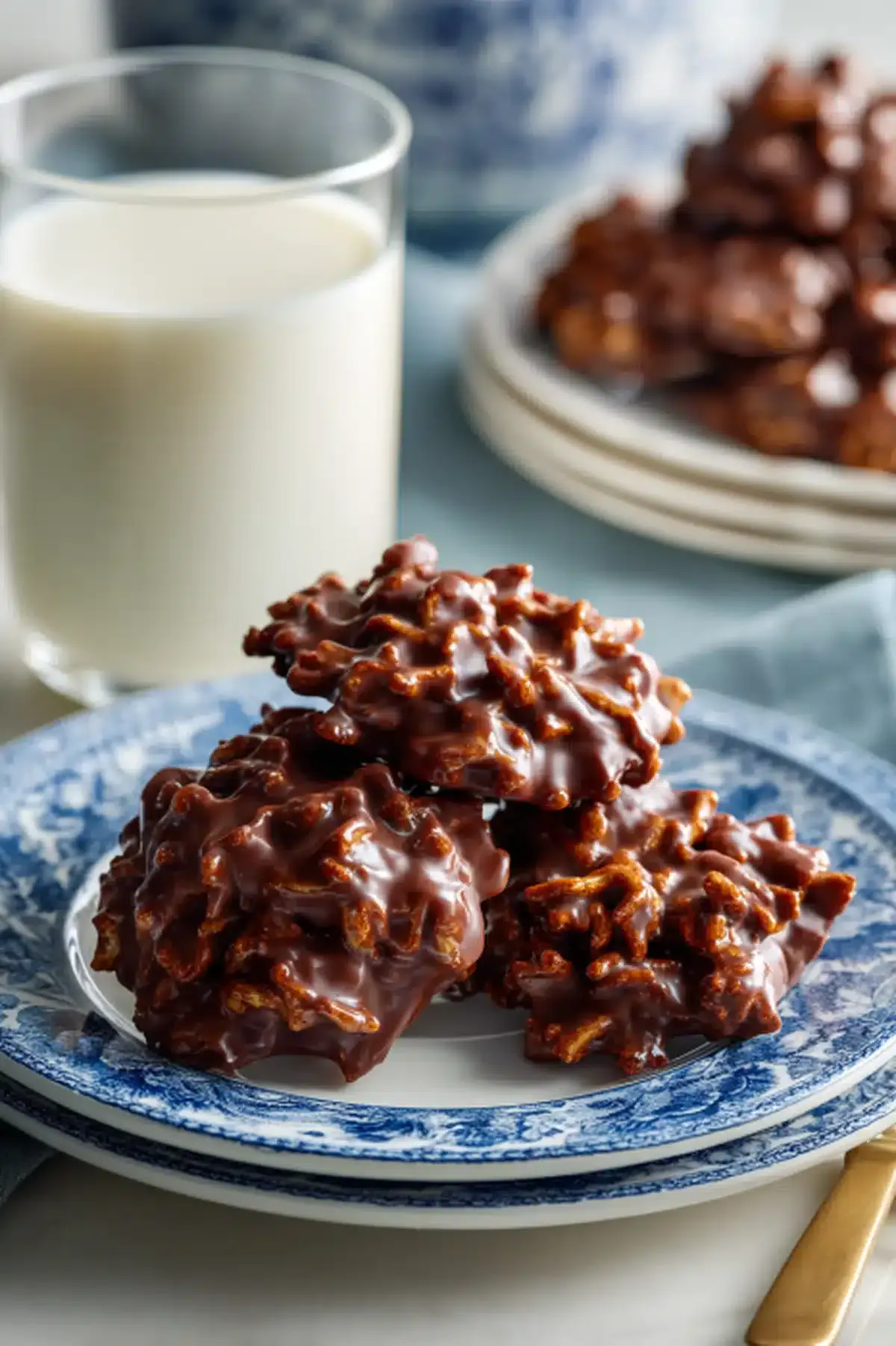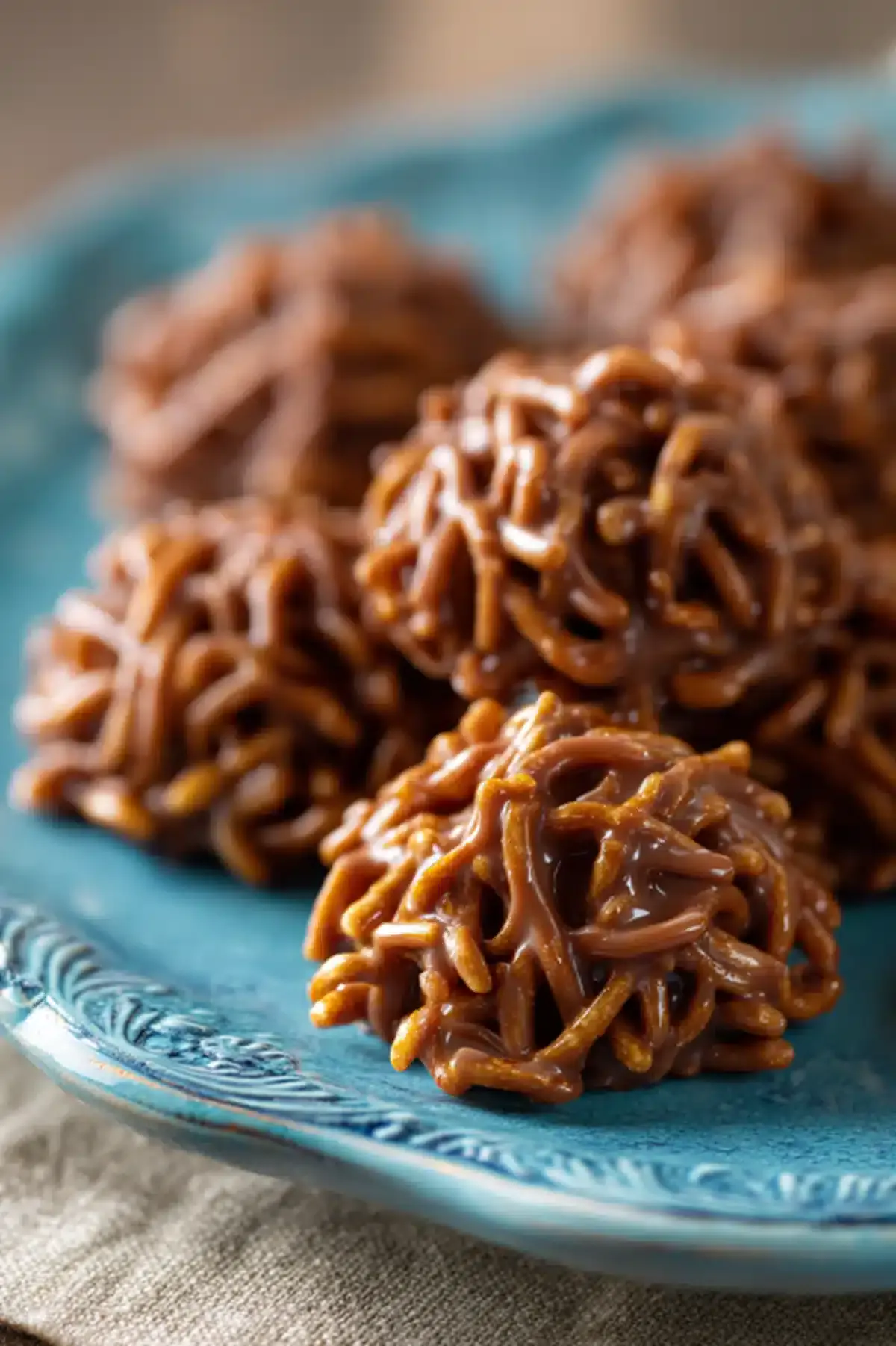 The name comes from their distinctive appearance! When you scoop the chocolate-coated chow mein noodles onto the baking sheet, they naturally fall into a piled, shaggy mound that looks remarkably like miniature haystacks you'd see on a farm. The crunchy noodles stick out at random angles, creating that authentic stack of hay look.