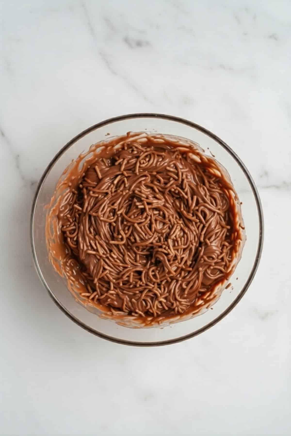 - Add chow mein noodles to the melted chocolate mixture.