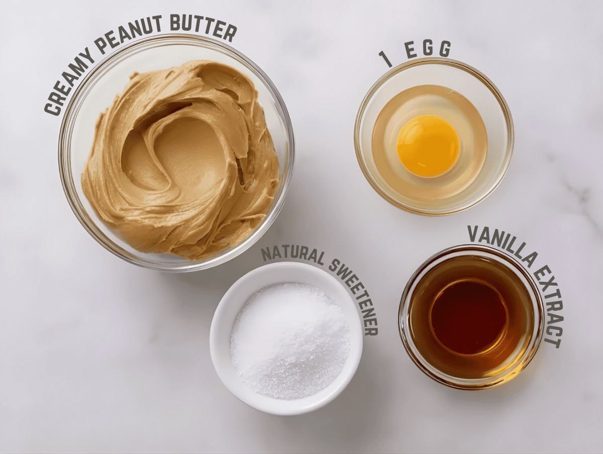 Just four ingredients you probably already have. No specialty flours, no hard-to-find sweeteners, no complicated steps. Natural peanut butter, a keto-friendly sweetener, an egg, and vanilla extract — that's it. When you're craving something sweet on a busy Tuesday evening, you can whip these up without a special trip to the store.