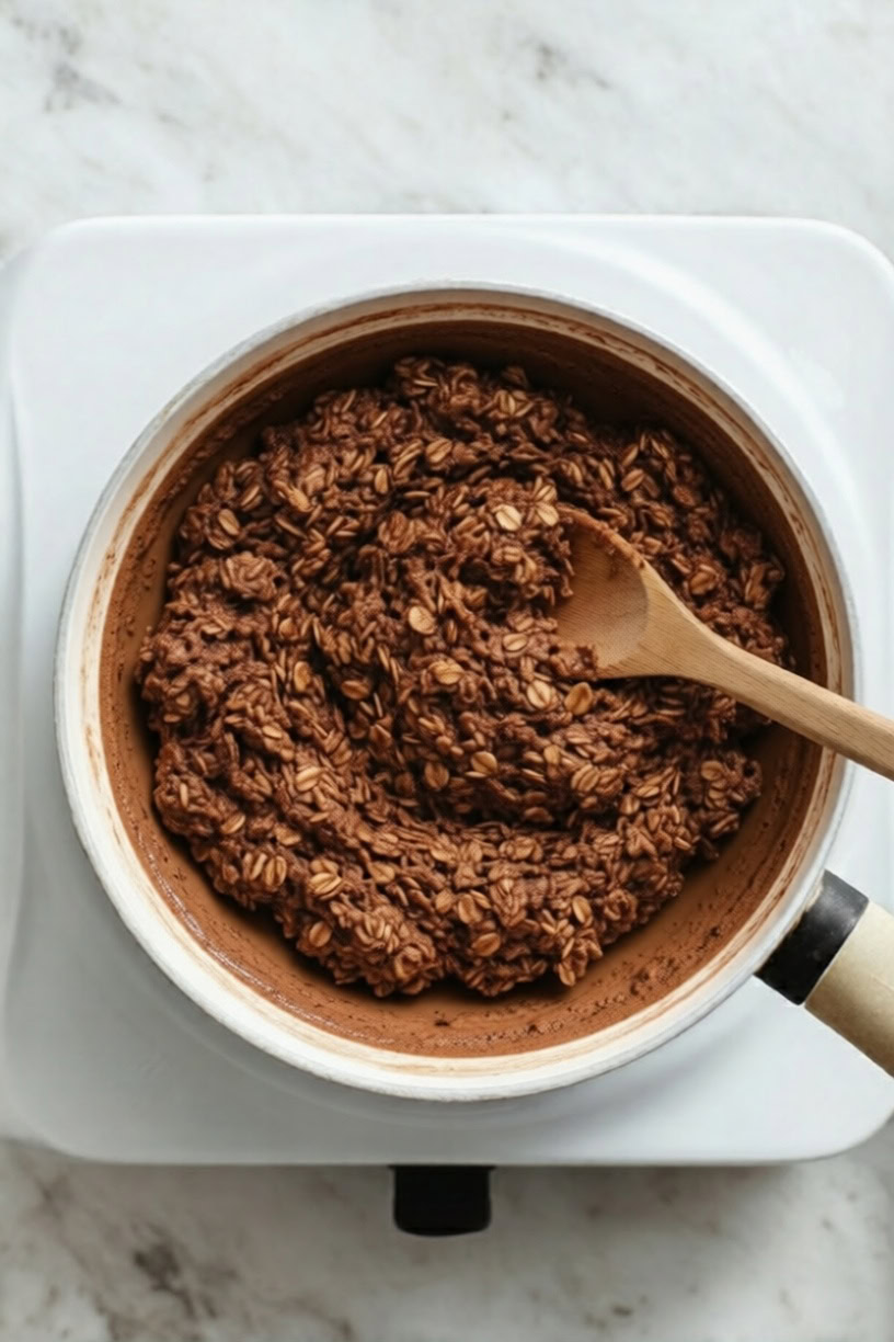 Quick-cooking oats work best because they absorb the chocolate mixture within 30-60 seconds. Old-fashioned oats take 2-3 minutes to absorb liquid, which means your mixture might start setting before the oats soften. If you only have old-fashioned oats, pulse them 3-4 times in a food processor to break them down slightly before using.