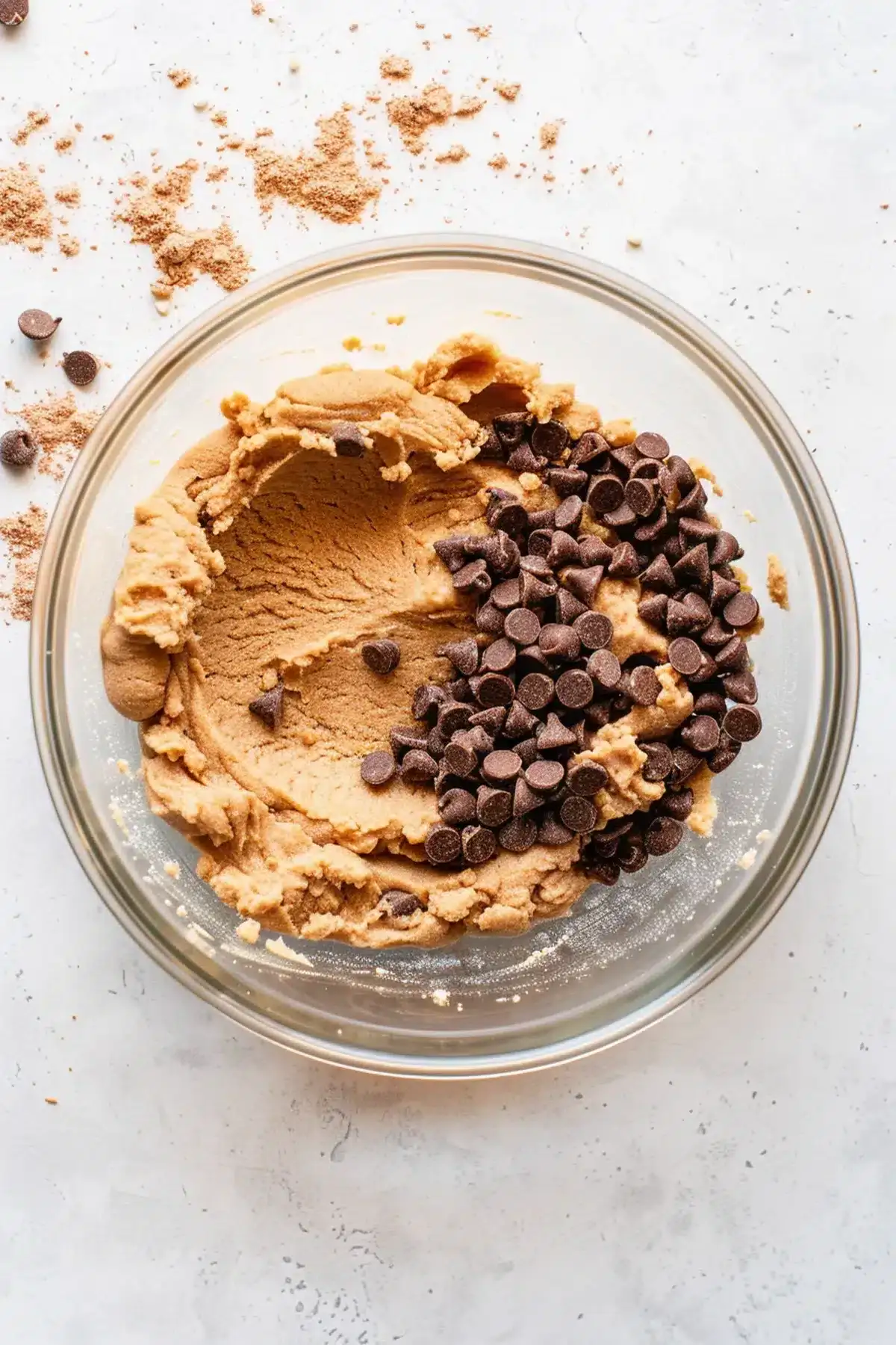 Once chilled, stir in the sugar-free chocolate chips. They go in last so they stay whole and don't melt into the warm dough.